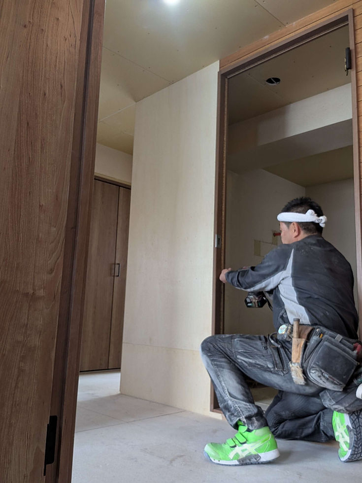 枠を下地に緊結(固定)して、後は戸当りも取付けてクロス貼りの下地ボードも取付けて…